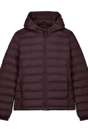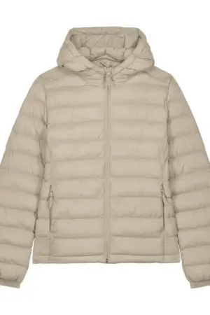 De buitenkant is gemaakt van 100% gerecycled nylon met een plain weave-structuur en een fluorine-vrije waterafstotende DWR-afwerking. De jas is licht gewatteerd en volledig gevoerd, waardoor hij warmte biedt zonder zwaar of log aan te voelen.